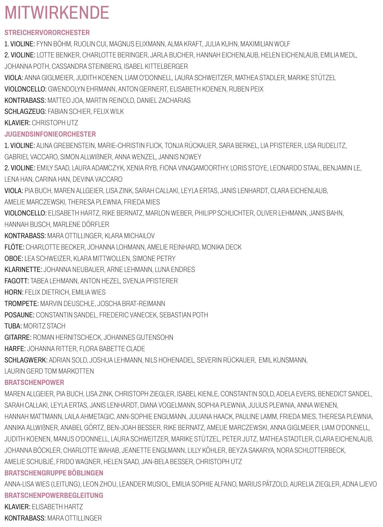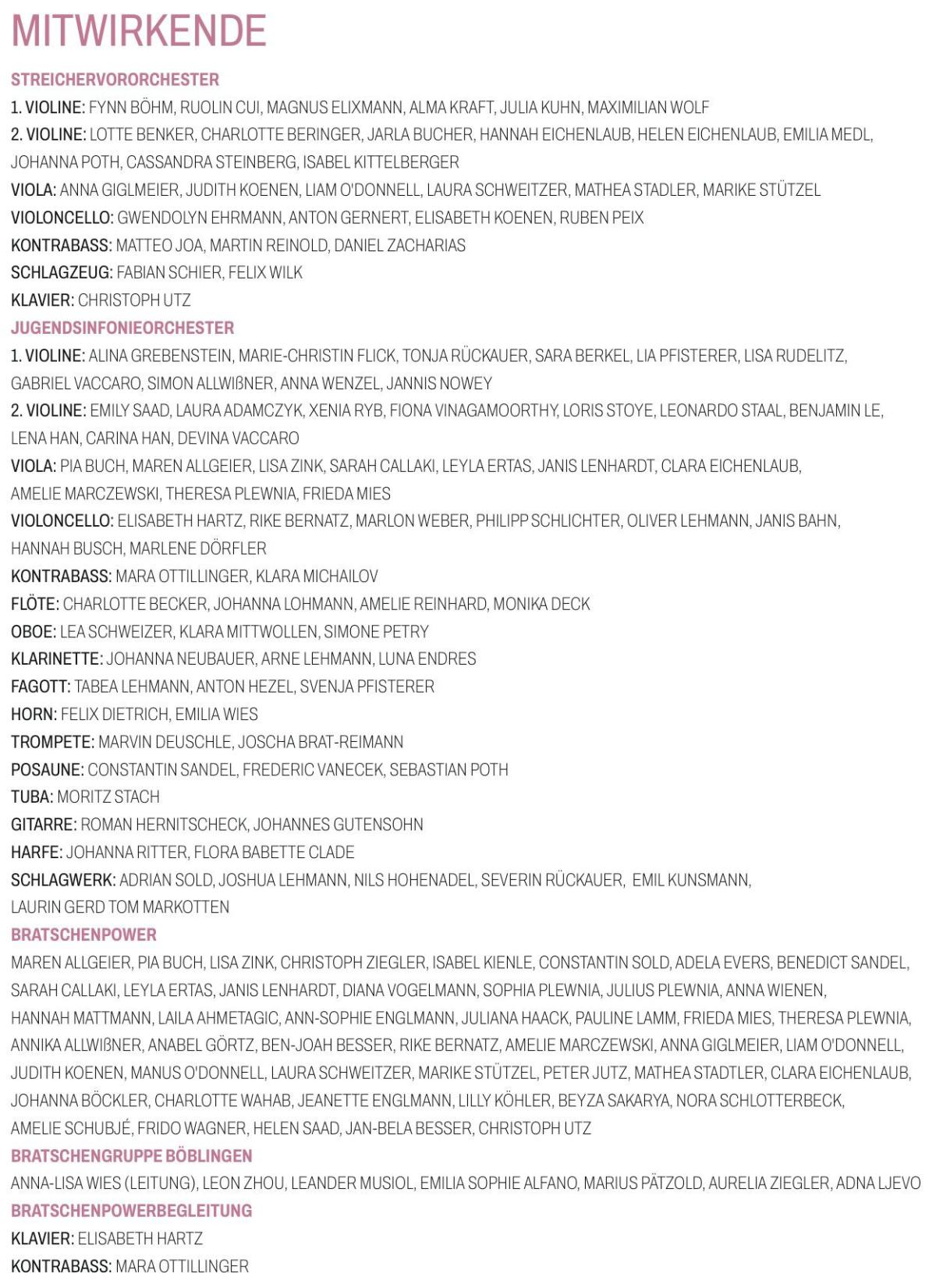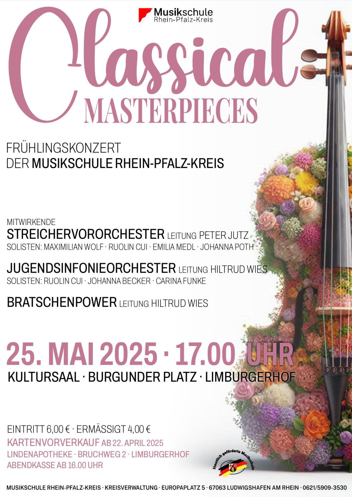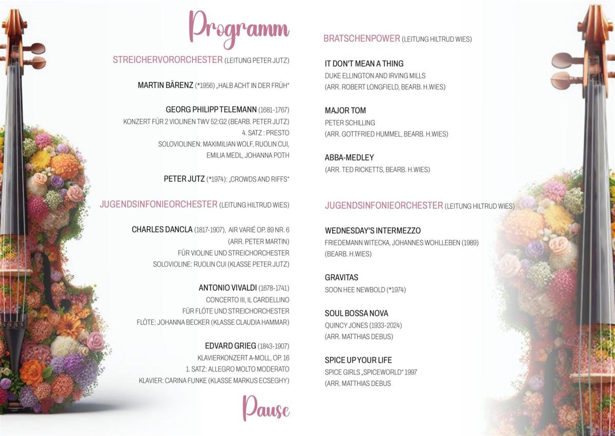 Das Frühlingskonzert der Fachgruppe Streichinstrumente steht in diesem Jahr unter dem Titel "Classical Masterpieces". Sie können sich auf ein äußerst attraktives und abwechslungsreiches Programm mit dem Streichervororchester unter der Leitung von Peter Jutz und dem erweiterten Jugendsinfonieorchester unter der Leitung von Hiltrud Wies freuen, die Sie mit barocken bis modernen Stücken, darunter auch 3 Solokonzerte, unterhalten werden. Ein Höhepunkt bildet in diesem Jahr wieder der Auftritt von "Bratschenpower", bei dem rund 50 Bratschistinnen und Bratschisten auf der Bühne stehen werden.